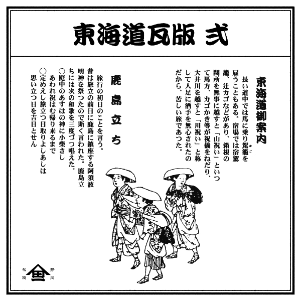 長い道中では馬に乗り駕籠(かご)を雇うこともある。宿場では宿駕籠、辻カゴなどがあり、箱根の関所を無事に越すと「山祝い」といつて馬方、カゴかき等が祝儀をねだり、大井川を越すと「川祝い」と称して人足に酒手を無心されたのだから、苦しい旅であつた。