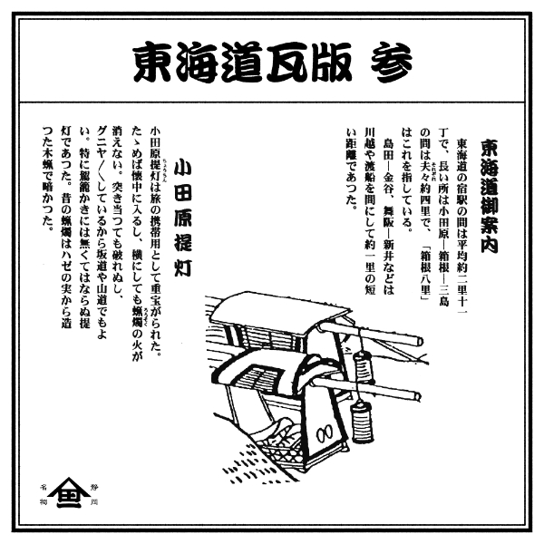 小田原提灯(ちょうちん)は旅の携帯用として重宝がられた。たゝめば懐中に入るし、横にしても蝋燭(ろうそく)の火が消えない。突き当つても破れぬし、グニャグニャしているから坂道や山道でもよい。特に駕籠かきには無くてはならぬ提灯であつた。昔の蝋燭はハゼの実から造った木蝋で暗かつた。